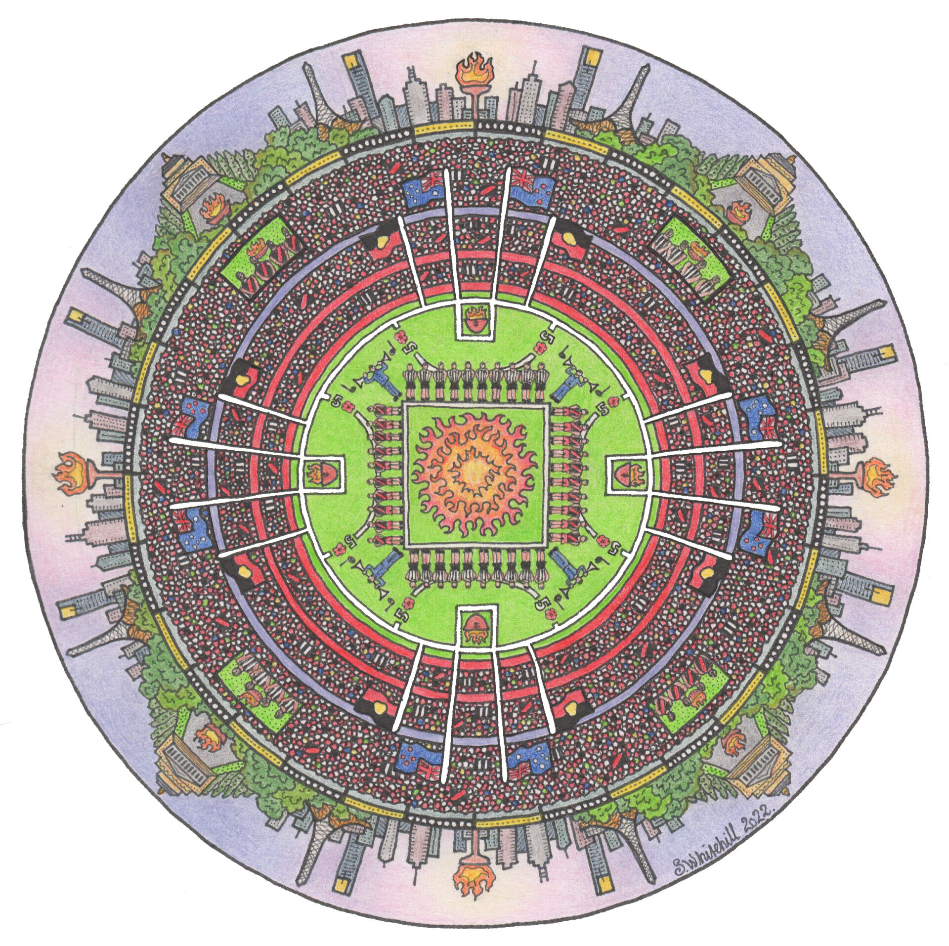 It occurred to me that should I capture the day in a mandala and as usual, I've adopted some artistic license, removing the lights from the light towers and replacing them with the eternal flame... and of course the Shrine of Remembrance is not so prominent on the Melbourne horizon as it is here... but was so significant to the day, as we remembered and appreciated all those whom had fought and fallen in the defence of our homeland.