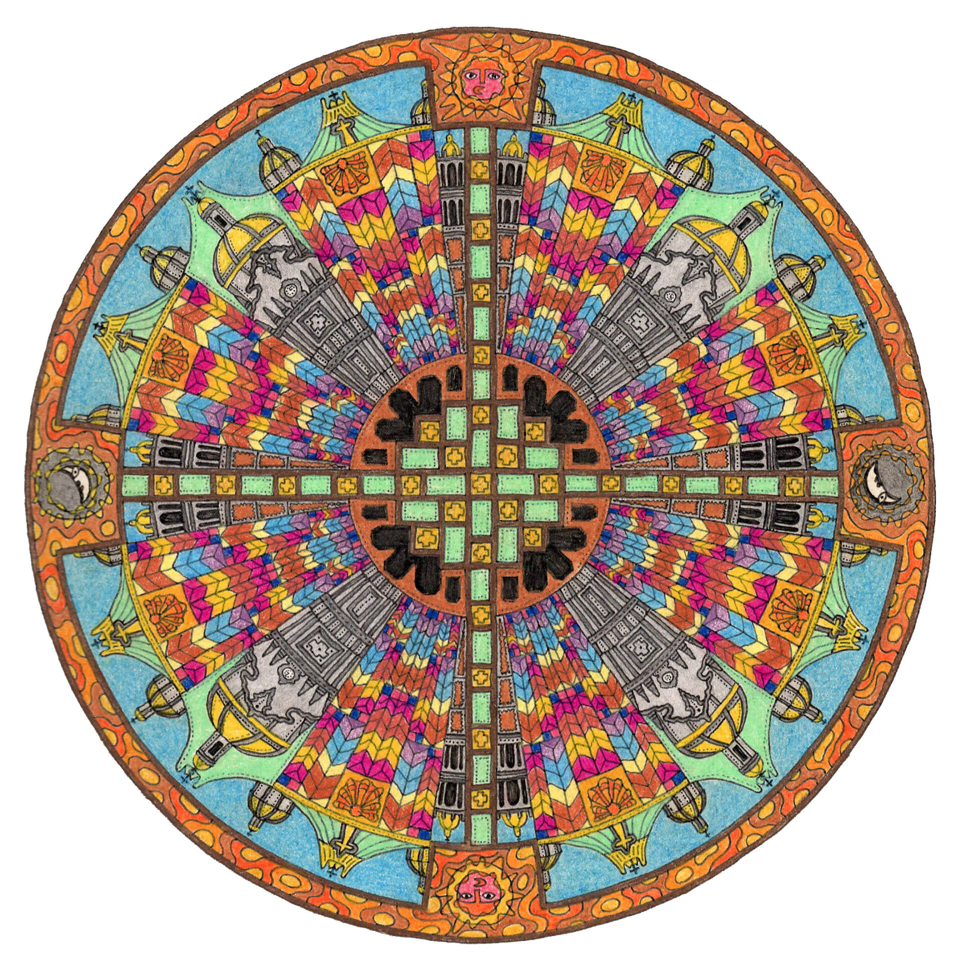 After a more than satisfying day visiting the Teotihuacan pyramids outside Mexico City, last stop was the site of these two magnificent cathedrals. The old beside its replacement, offers a stark contrast in styles. Of course, there are few straight lines in Mexico City... and more than there should be, too, for the cracks. The place is sinking into the drained lake that it was built upon, and the old cathedral here offers plenty of evidence of that, leaning and separating here and there. The new is broad and airy, with some fantastic geometric stained glass panels. Had just time enough to enjoy the sun setting behind the odd pair.
