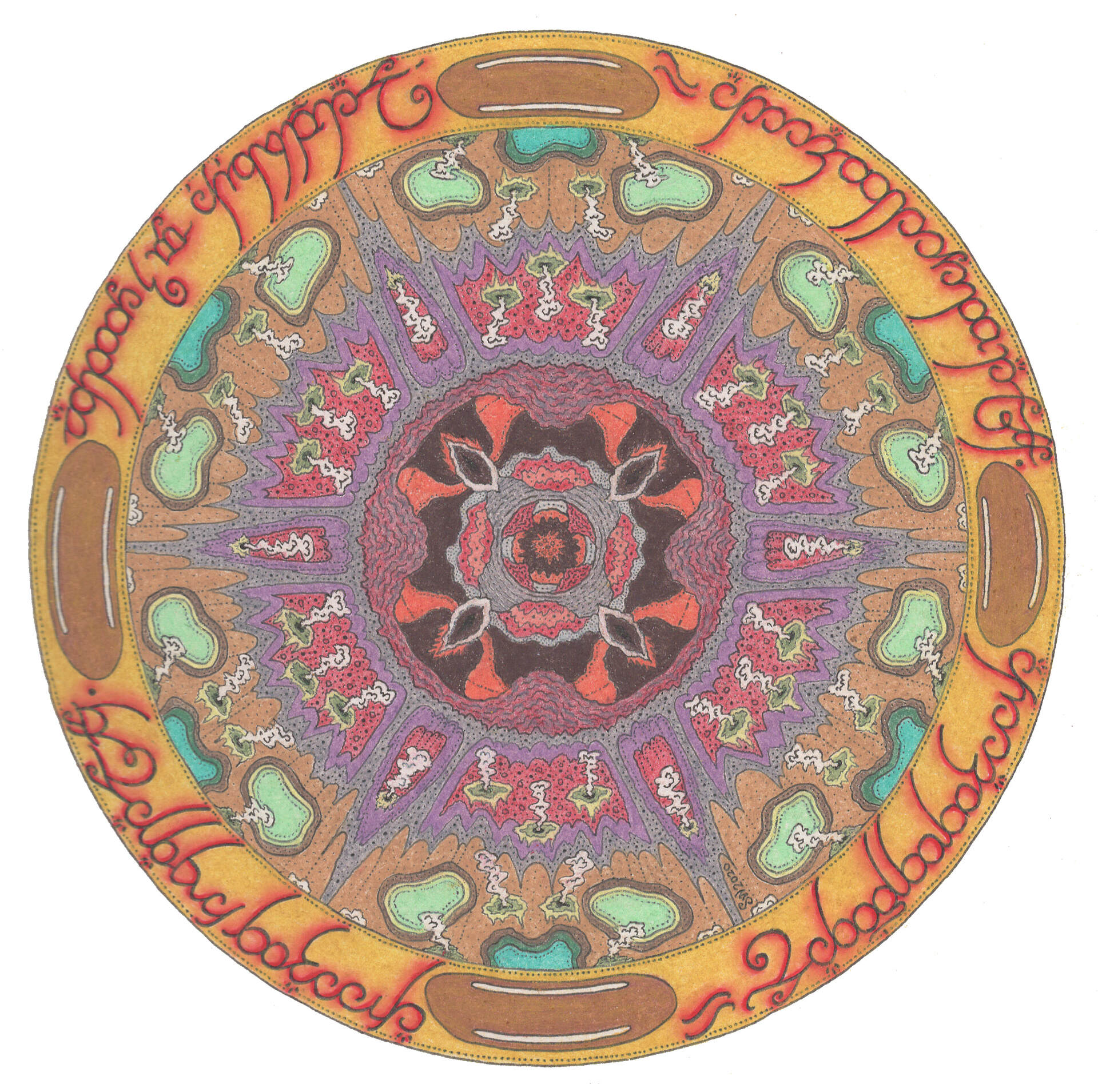 Mt Ngaruhoe can be found in the Tongariro National Park in the middle of New Zealand's north island. Most people won't know it by name, but may be more familiar with it than they realise, since this volcano was used as Mt Doom in The Lord of the Rings trilogy. Hence my clumsy representation of the ring of power around the outside of the mandala.