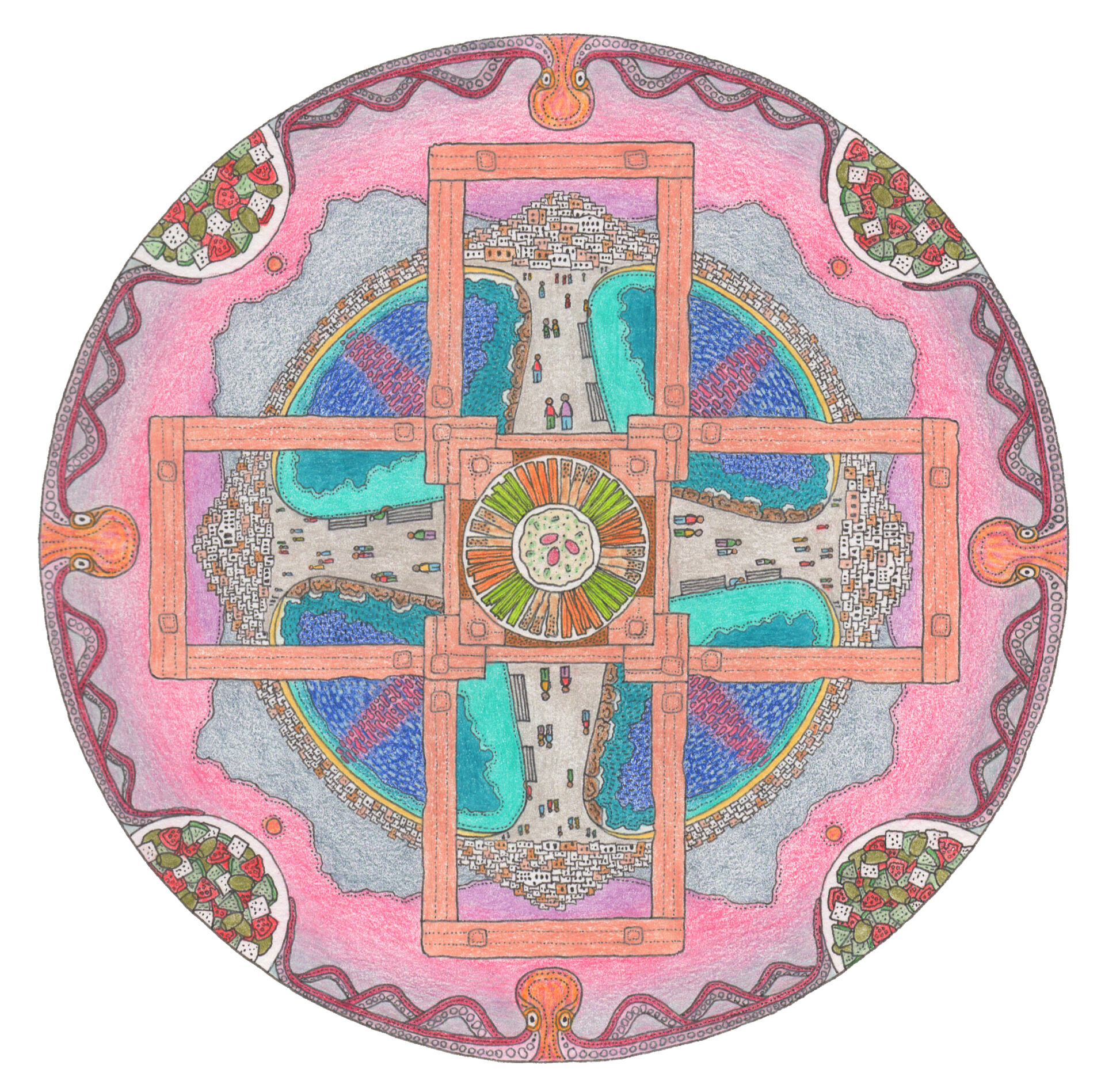 The port town is also named Naxos, and is a charming huddle of white-washed homes and shops on a small hill with a modest castle on top. On a small headland a short walk from the village, are the ruins of Apollo's Temple, with only its famous, stone entrance still standing. It wasn't hard to gather imagery for this drawing, and clumsy though it is, it's an excellent diary of our experience on the great island.