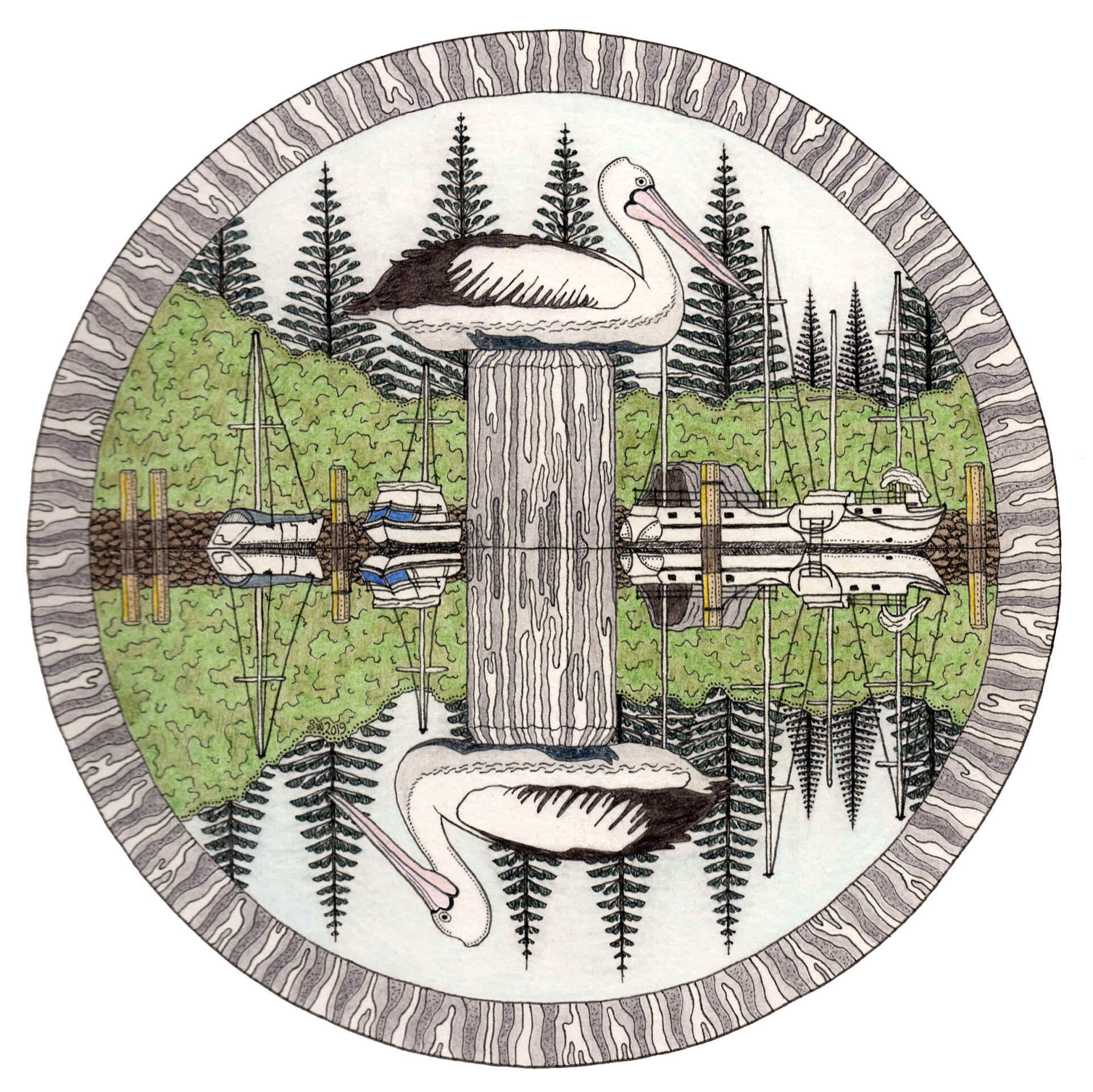 In mid 2019 I took my van Vincent up the east coast of Australia for a few months, to escape the cooler winter months down south, and to have some time and space to enjoy the freedom of the van-life and do some drawing. I arrived in Brunswick heads one morning at the marina, and found this pelican sitting on a mooring post, one that it or another had clearly sat on before, such a mess of bird-shit dribbles was the post! The water was calm, not entirely reflective, but I decided to do a drawing of the scene. For a little interest and balance, I spun the pelican around in the reflection, because you can do that when it's your drawing.