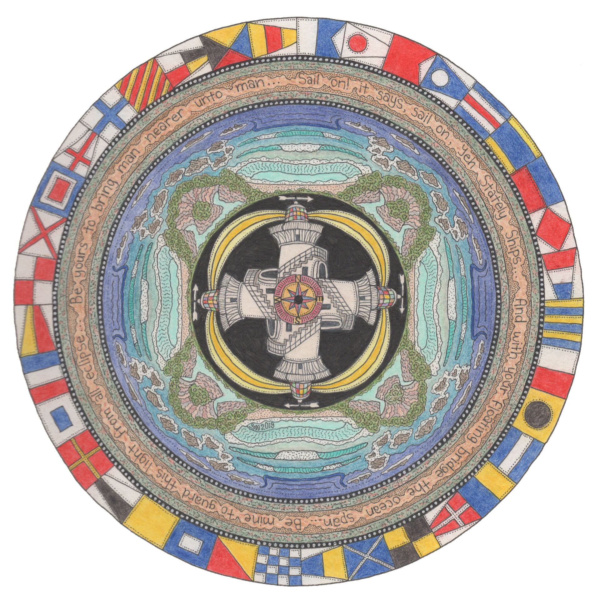 At the entrance to the lighthouse, the last stanza of the poem by Henry Wadsworth Longfellow called 'The Lighthouse'. I've incorporated it into the mandala too...