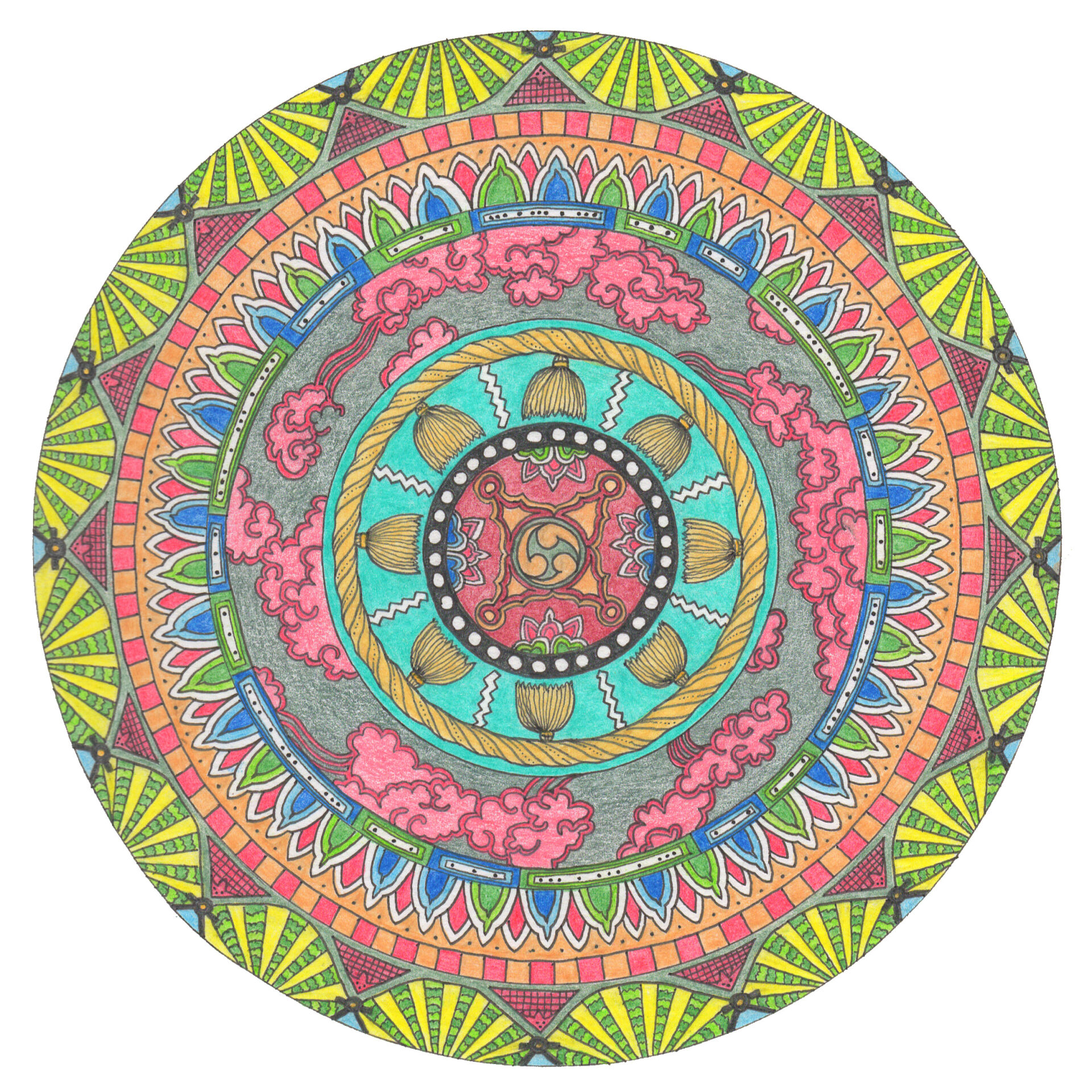 Takahara Kumano Ginja is a small temple that you pass on the first day of the Kumano Kodo pilgrimage in Japan. It's a pretty modest little shrine, which was empty on the afternoon I stopped by with a friend in mid 2017. We were fresh on the path, and so only spent a few minutes to look around, and to stamp our Kumano Kodo 'passports' with the stamp and red ink provided, before walking on. I put this mandala together from the many ornamental features of the temple. I really liked the colours of the place, and so I've tried to stay true to that in this image...